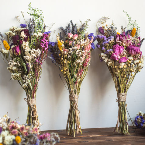 Dried flowers, lovingly glued onto a wood or wicker heart frame.